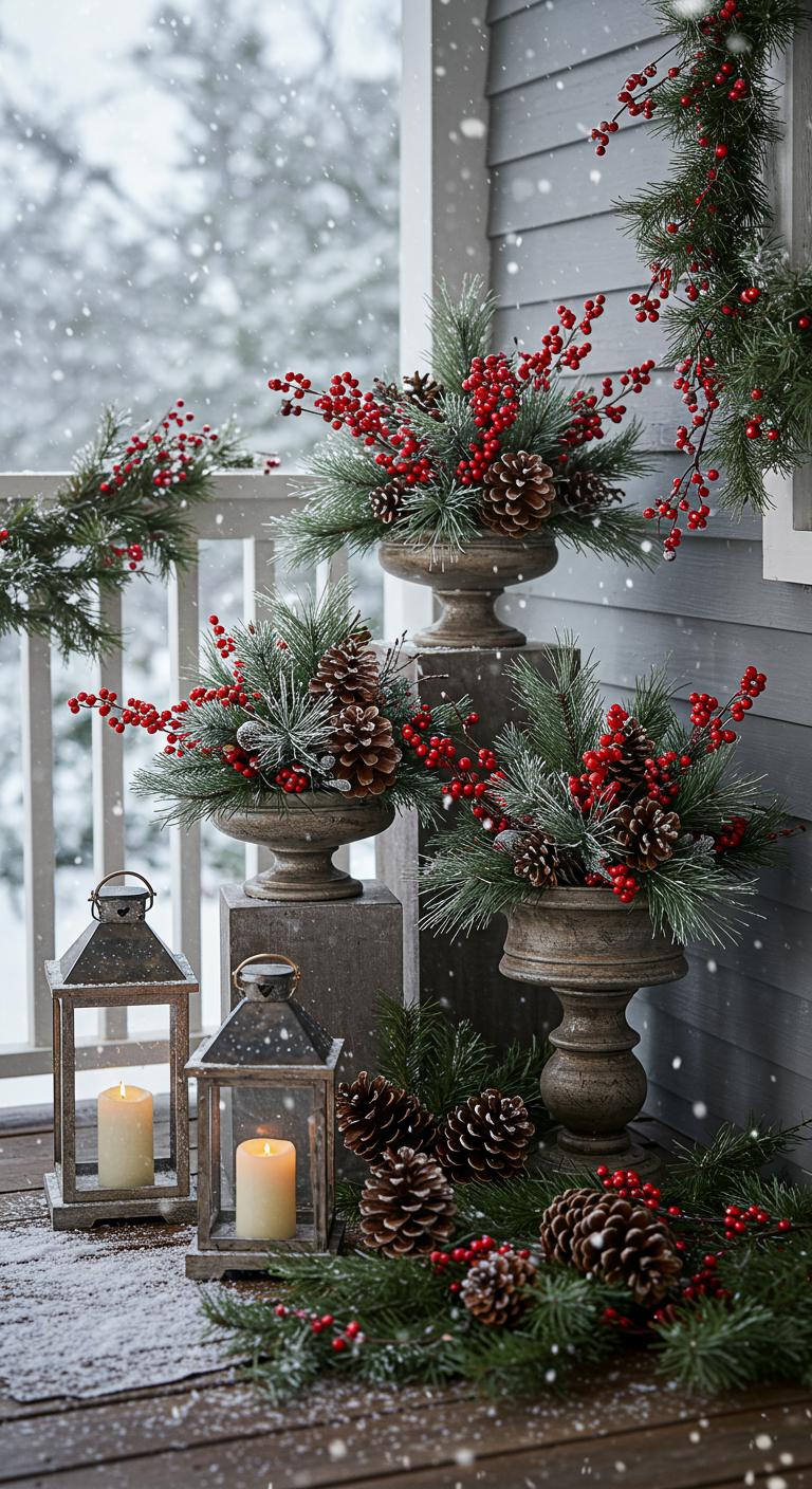 You’ll place pinecone centerpieces on low pedestals or step edges, tuck berry accents into garlands, and secure everything against wind.
