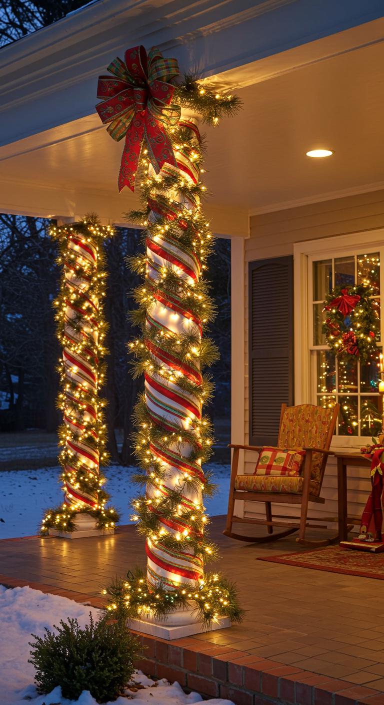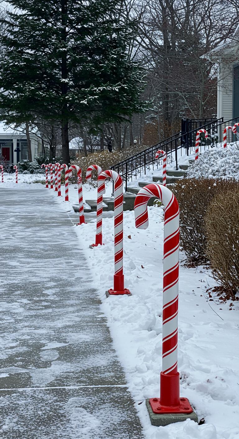 Because bold vertical accents instantly define walkways and driveways, candy cane bollards are a simple way to make a big seasonal statement: place evenly spaced, weatherproofed posts painted in glossy red-and-white spirals to frame paths, highlight steps, or guard planting beds.