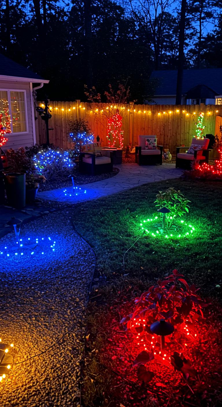 If you want your yard to read like a well-composed holiday tableau, divide outdoor spaces into color-blocked lighting zones and let each area tell its own story—cool blues for pathway corridors, warm ambers for seating nooks, and bold reds or greens for focal plantings.