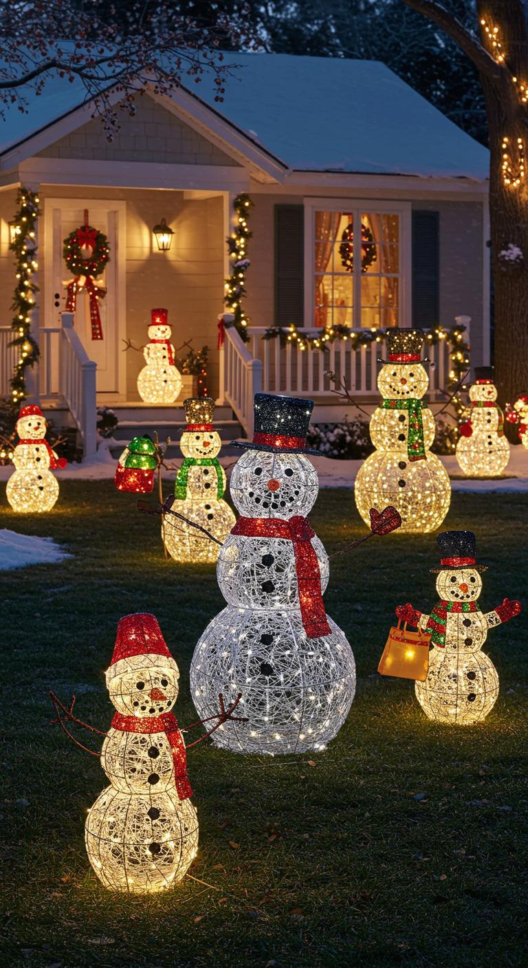 When you place illuminated wire-frame snowmen in clusters, they turn ordinary lawns into sculptural focal points that read clearly from the street and from the porch.