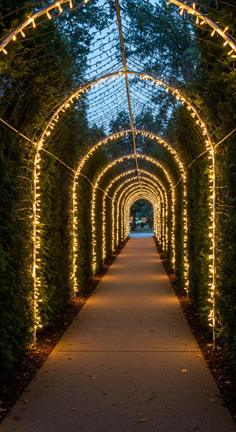 Because you walk through it, an evergreen tunnel lined with twinkling lights becomes a lived pathway rather than just a decoration; you shape evergreen archways to frame views, guide guests, and create intimate moments.