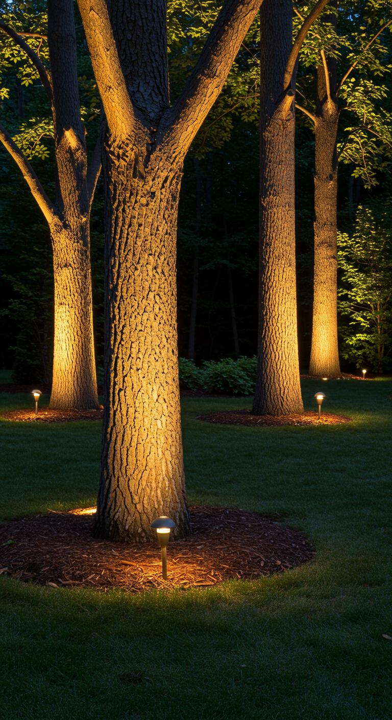 You’ll position tree trunk lighting to avoid glare, hide fixtures among roots, and aim beams for layered silhouettes.