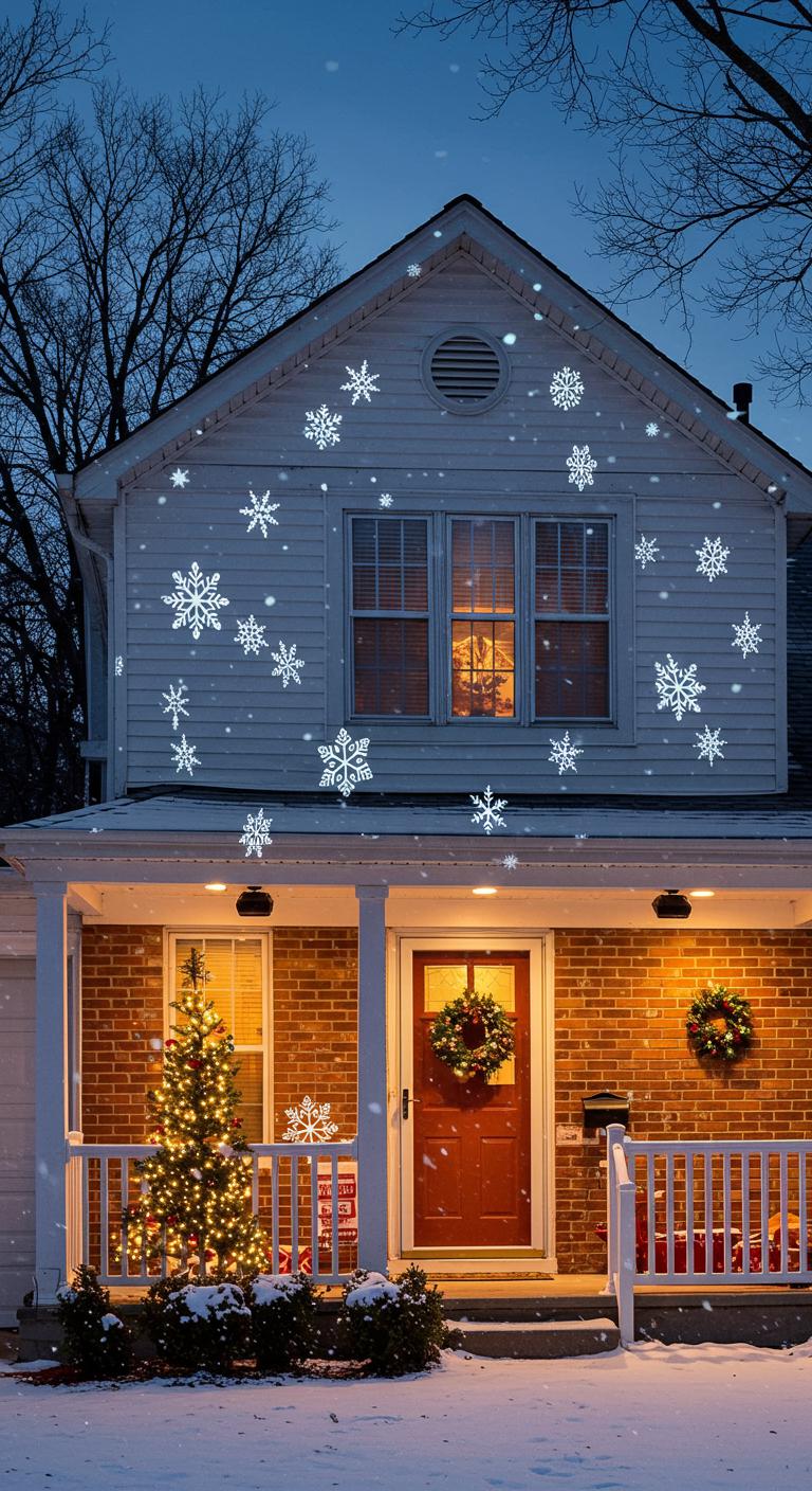 When you sweep delicate snowflake gobos across a home’s façade, they turn plain siding and brick into a dynamic winter tapestry that reads clearly from the street; place your projectors on stable, low-profile mounts and aim slightly downward to avoid shining into windows.