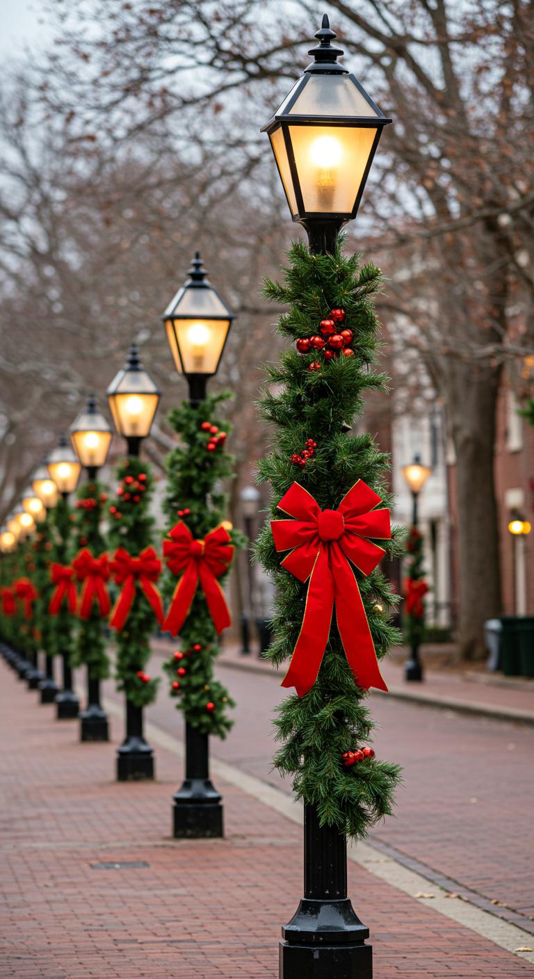 A single bold bow and a coil of fresh greenery can turn a plain lamp post into a welcoming holiday anchor for your street.