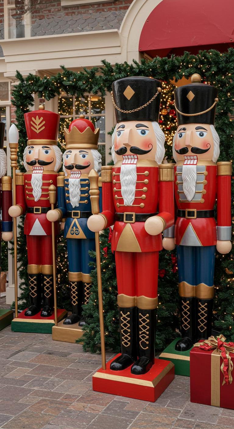Think bold: oversized nutcracker statues instantly anchor your outdoor display and give guests a festive focal point that reads from the curb.