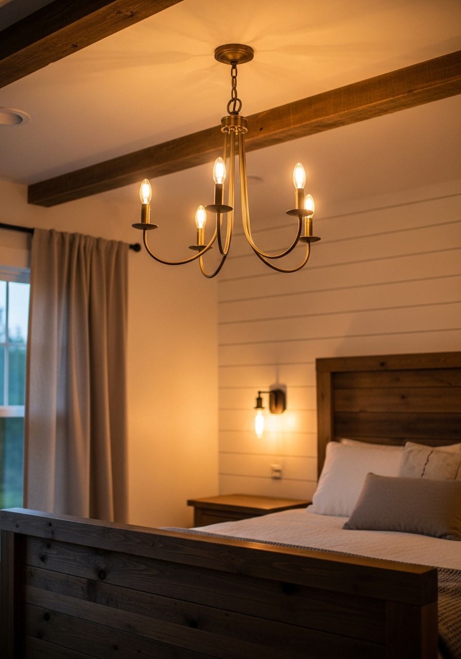 Adding a vintage chandelier can totally elevate your farmhouse bedroom without overwhelming the space. I hung one in my guest room last year, and it casts this magical, soft light that makes everything feel extra cozy at night. You could pair it with some sheer curtains for that perfect rustic touch – it’s such an easy upgrade.