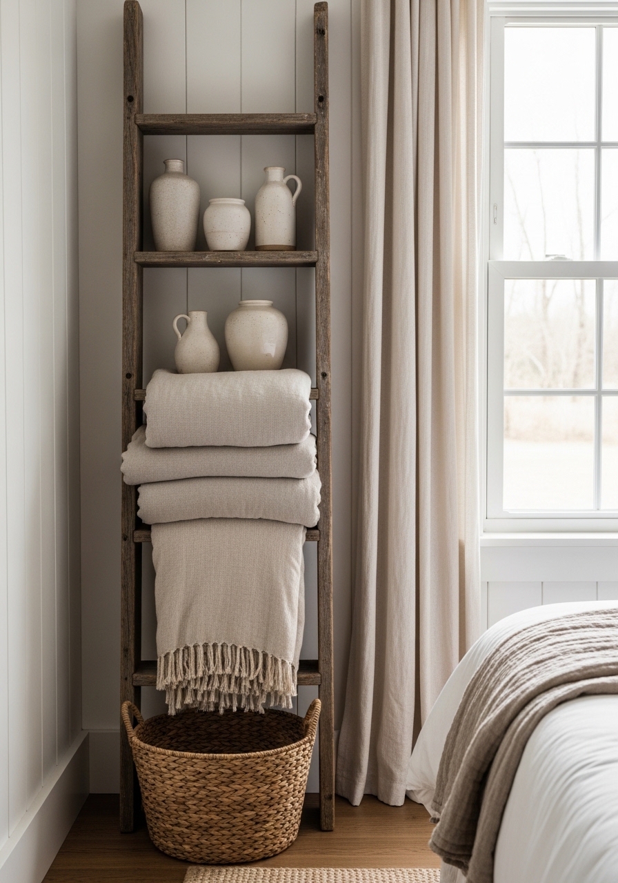 Incorporating a rustic ladder shelf is a clever way to add storage and charm without taking up floor space. I propped one up in my room for throws and books, and it made everything feel more organized yet whimsical. It’s perfect for displaying those flea market finds you love collecting.