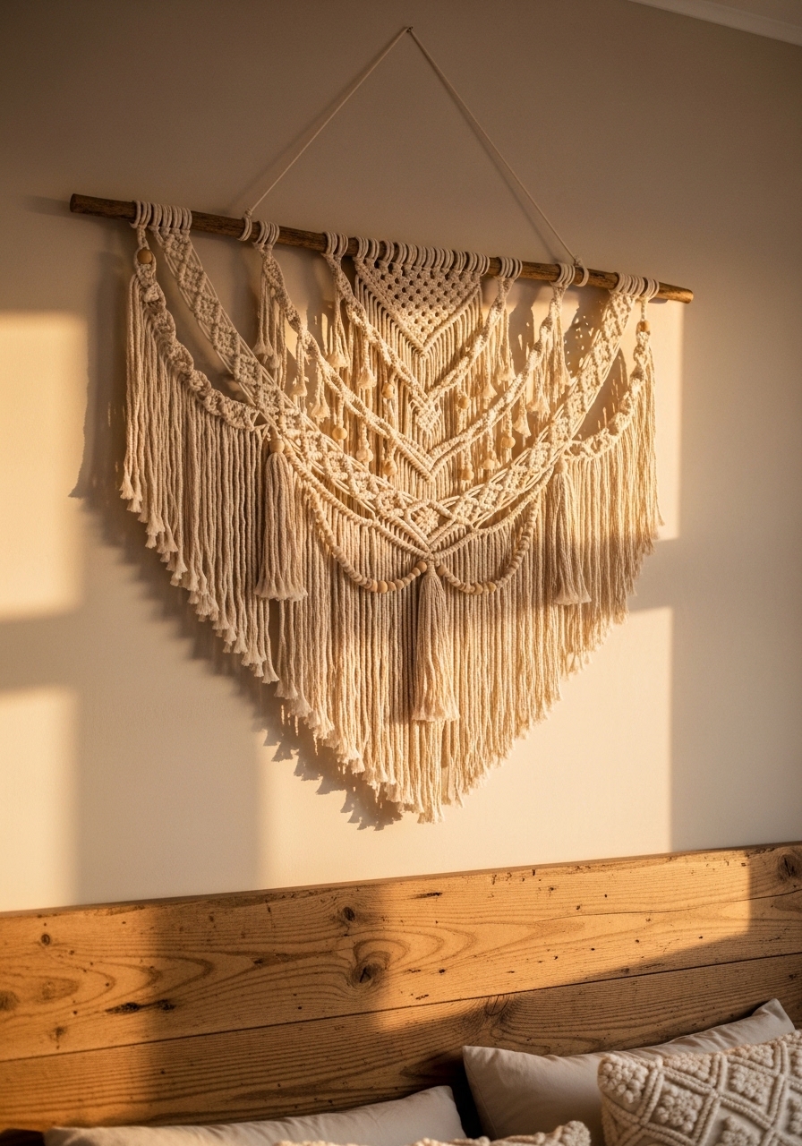 Hanging a macrame piece adds boho flair to the farmhouse coziness, softening walls with texture. I made one myself last fall, and it was therapeutic – though mine turned out a bit lopsided at first. It’s an affordable way to personalize and make the room feel uniquely yours.