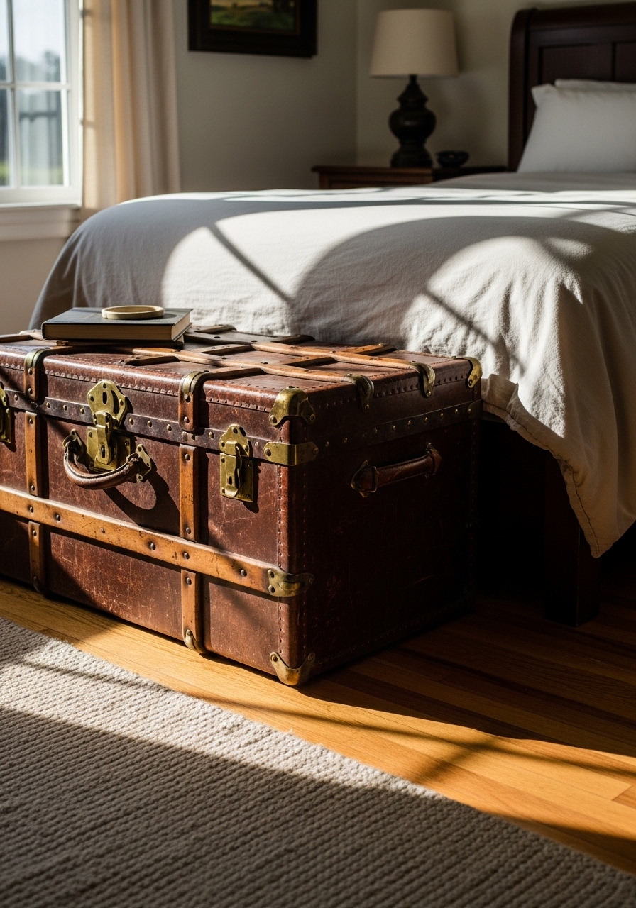 Using an antique trunk for storage at the bed’s end combines utility with vintage charm. Mine holds extra blankets, and it’s a spot to sit while putting on shoes. It adds that authentic farmhouse story without cluttering the room – plus, hunting for one at markets is half the fun.