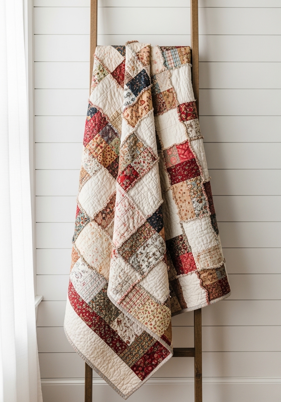 Turn an old ladder into a quilt rack by sanding it down and leaning it against the wall – perfect for displaying heirloom blankets affordably. I found my ladder at a yard sale for $5. It adds color and history to the room, and folding quilts over it is way easier than hanging art.