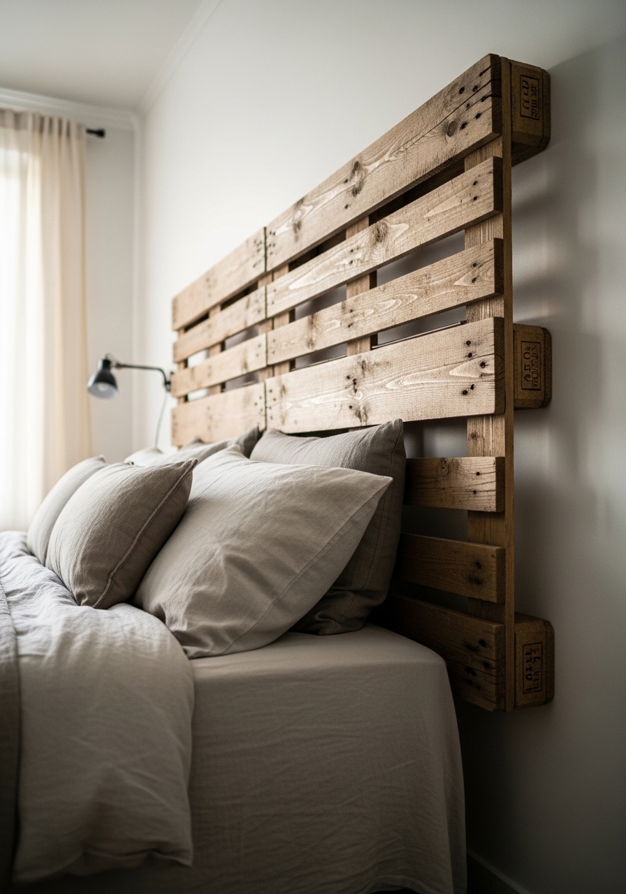Scavenge free pallets and assemble a headboard with basic tools – sand it smooth for that polished farmhouse look. It’s eco-friendly and costs next to nothing. When I built mine, it was uneven at first, but adding brackets fixed it right up, and now it’s my favorite DIY piece.