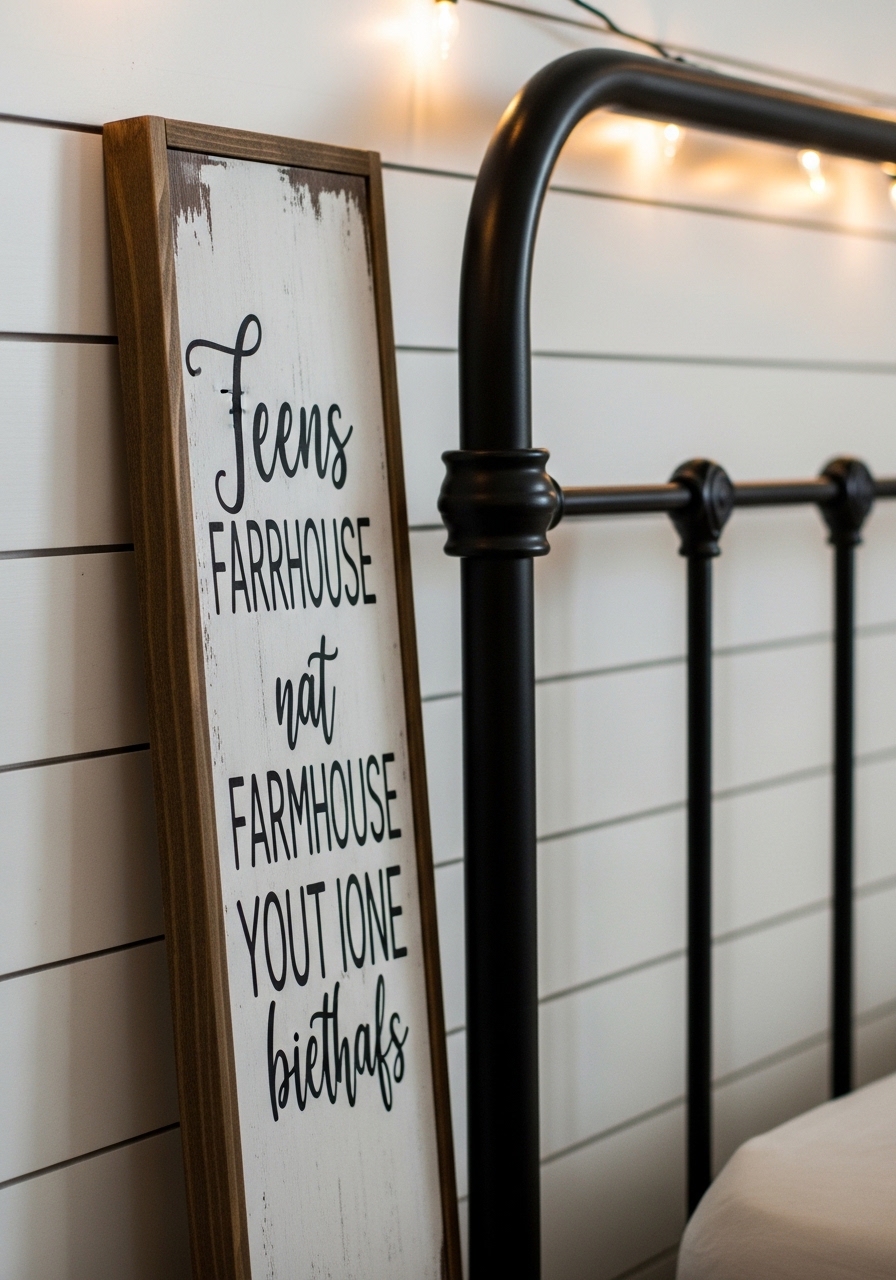 Paint simple sayings on salvaged wood for custom signage that nods to farmhouse vibes – hang or lean them for easy swaps. I made one saying “sweet dreams” with leftover paint. It personalizes the space without buying art, and mine has a charming crack from drying too fast.