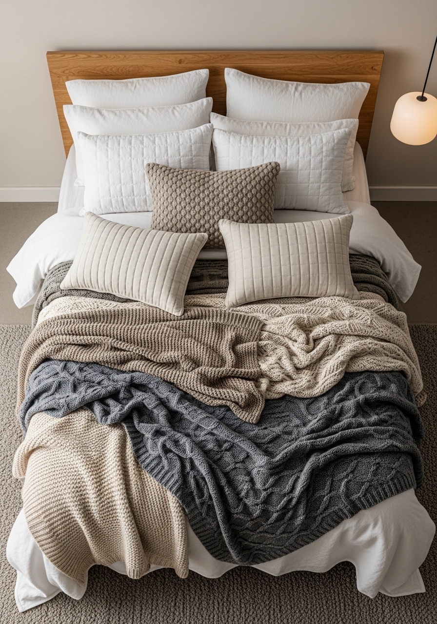 Mix thrifted quilts, knits, and pillows in neutrals for a plush, inviting bed that’s all about texture on a budget. Fold them artfully for that styled look. You can rotate seasonally; I added wool in winter, and it made snuggling in so much better, even if the colors don’t perfectly match.