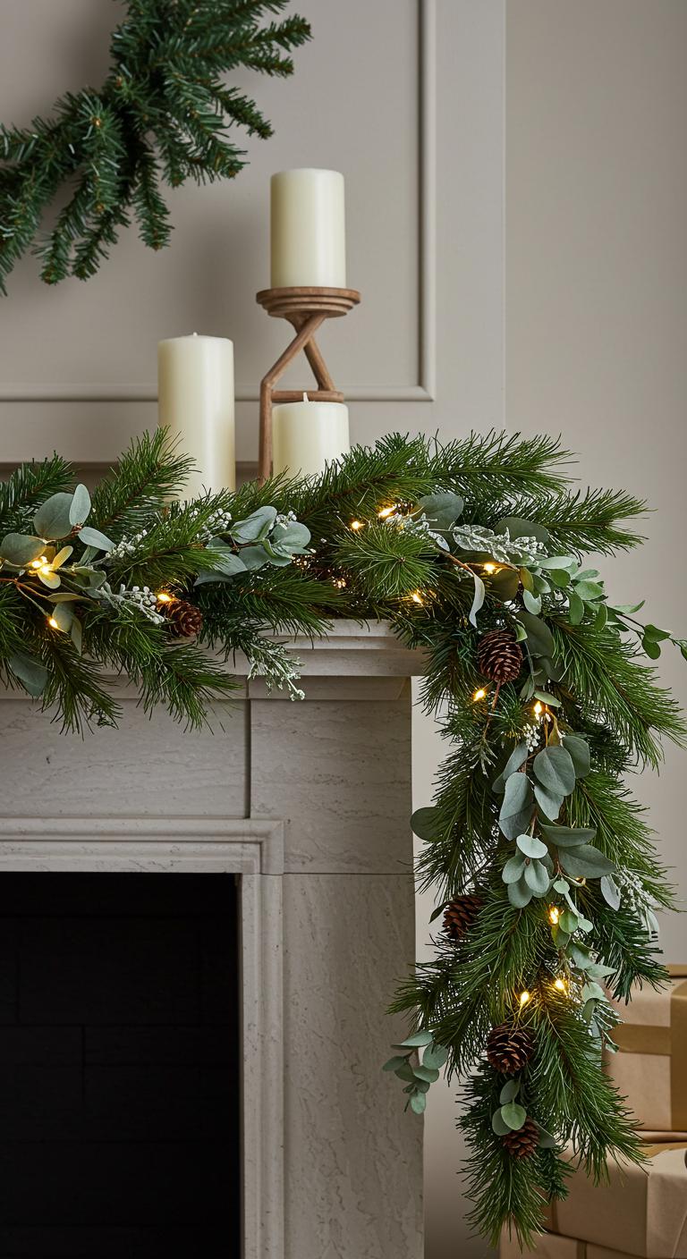 Adorn your fireplace mantels with twinkling lights and lush greenery, creating an inviting atmosphere.