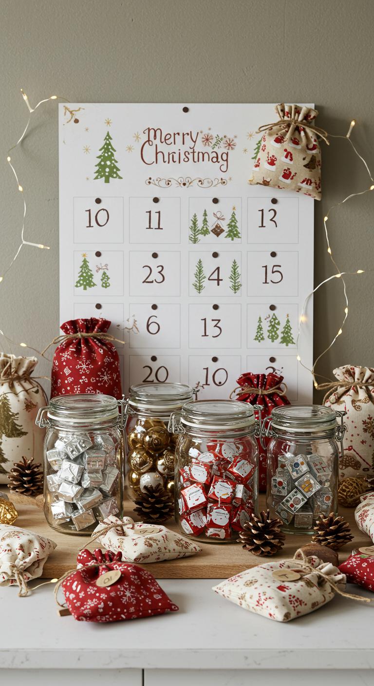 Explore various DIY calendar ideas, like using repurposed jars or festive fabric pouches, to create unique countdown crafts. Each day will reveal a surprise, filling your home with joy and anticipation throughout the season.