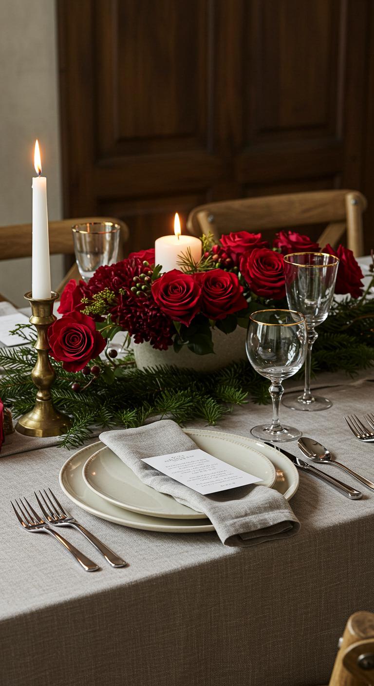 Use rustic linens to showcase natural textures, and adorn your table with seasonal florals like deep red roses or evergreen sprigs.