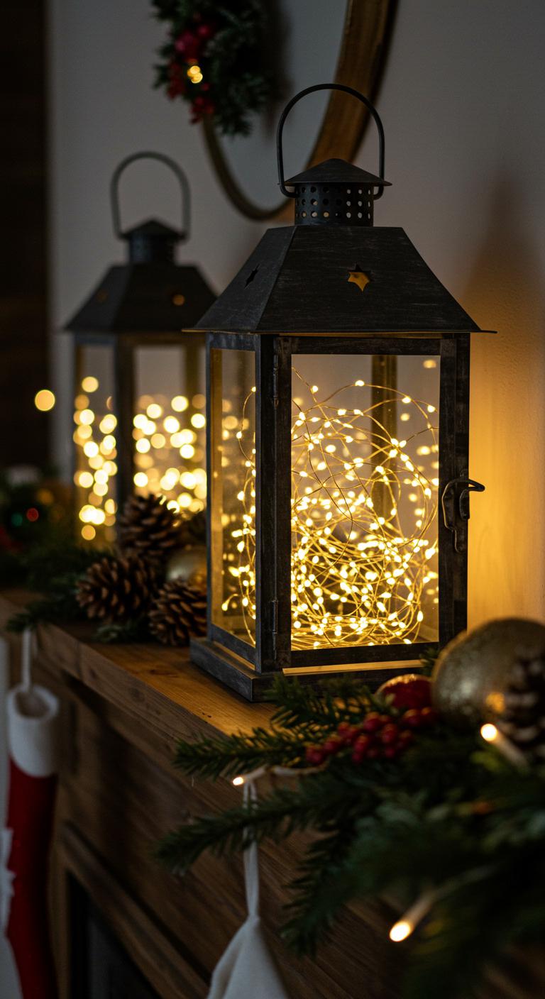 Transform your holiday decor with rustic lanterns filled with twinkling fairy lights that instantly elevate the ambiance of any space.