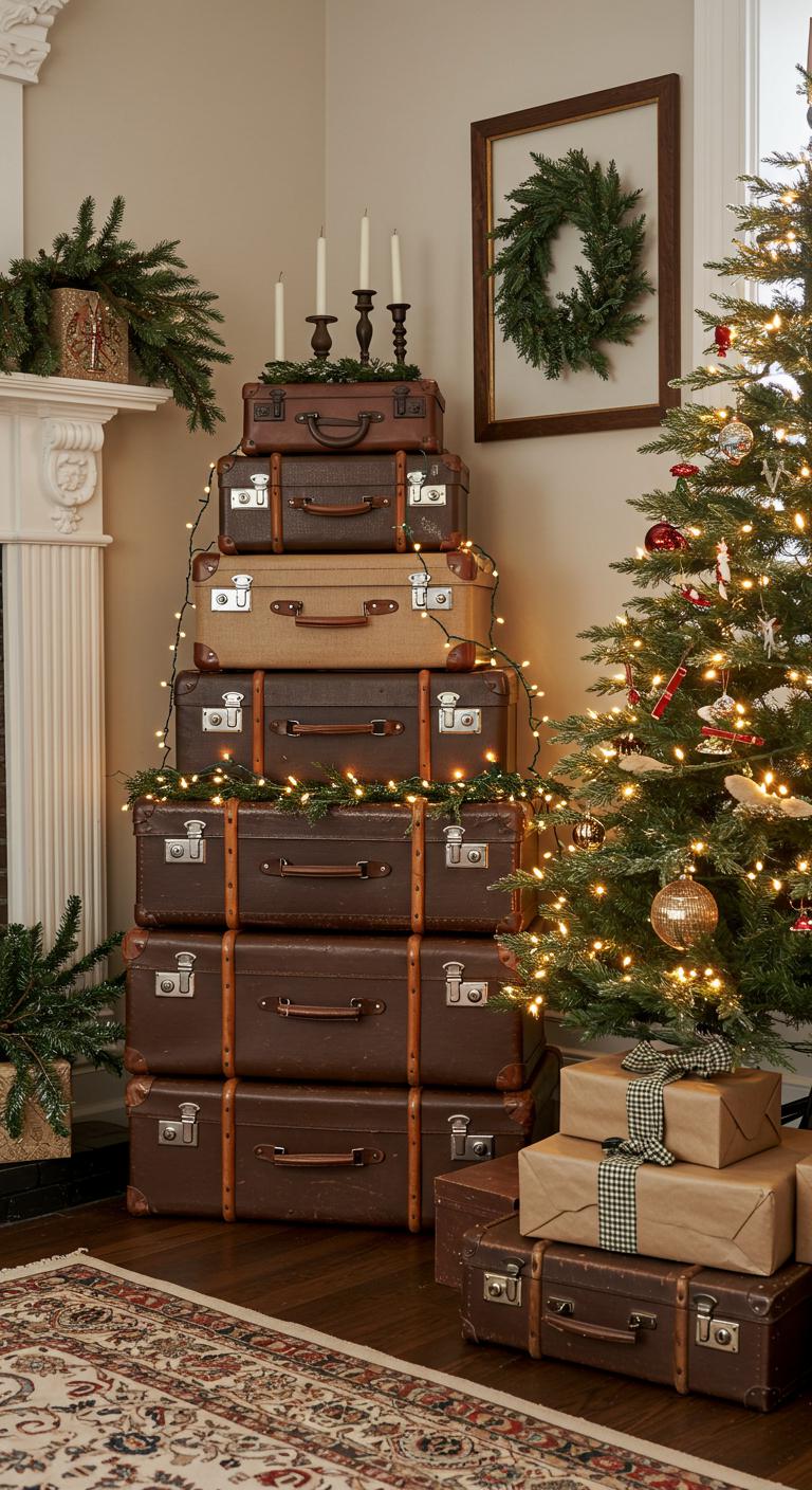 Vintage suitcases can add a charming touch to your holiday decor, infusing your space with nostalgic warmth.
