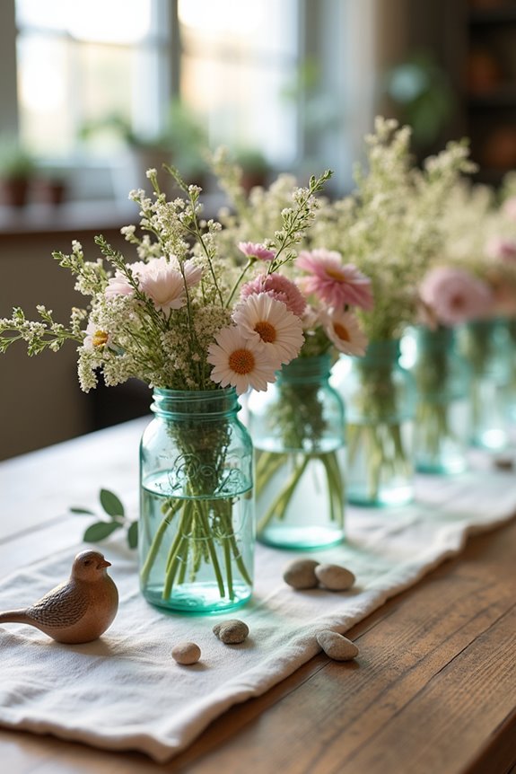 Explore various mason jar uses by mixing sizes and colors, creating a visually appealing arrangement that captures attention and adds warmth to your living space.