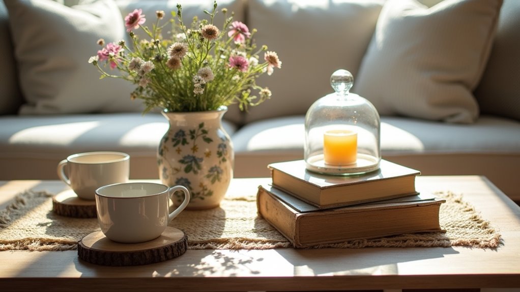 If you're looking to elevate your living space, farmhouse coffee table decor offers the perfect blend of rustic charm and personal flair. Imagine stacked vintage books paired with fresh greenery, or a rustic tray adorned with candles and blooms. Each detail can transform your coffee table into a stylish focal point. Curious about how to create that inviting atmosphere? Let's explore some stunning ideas that will inspire your next decor project.