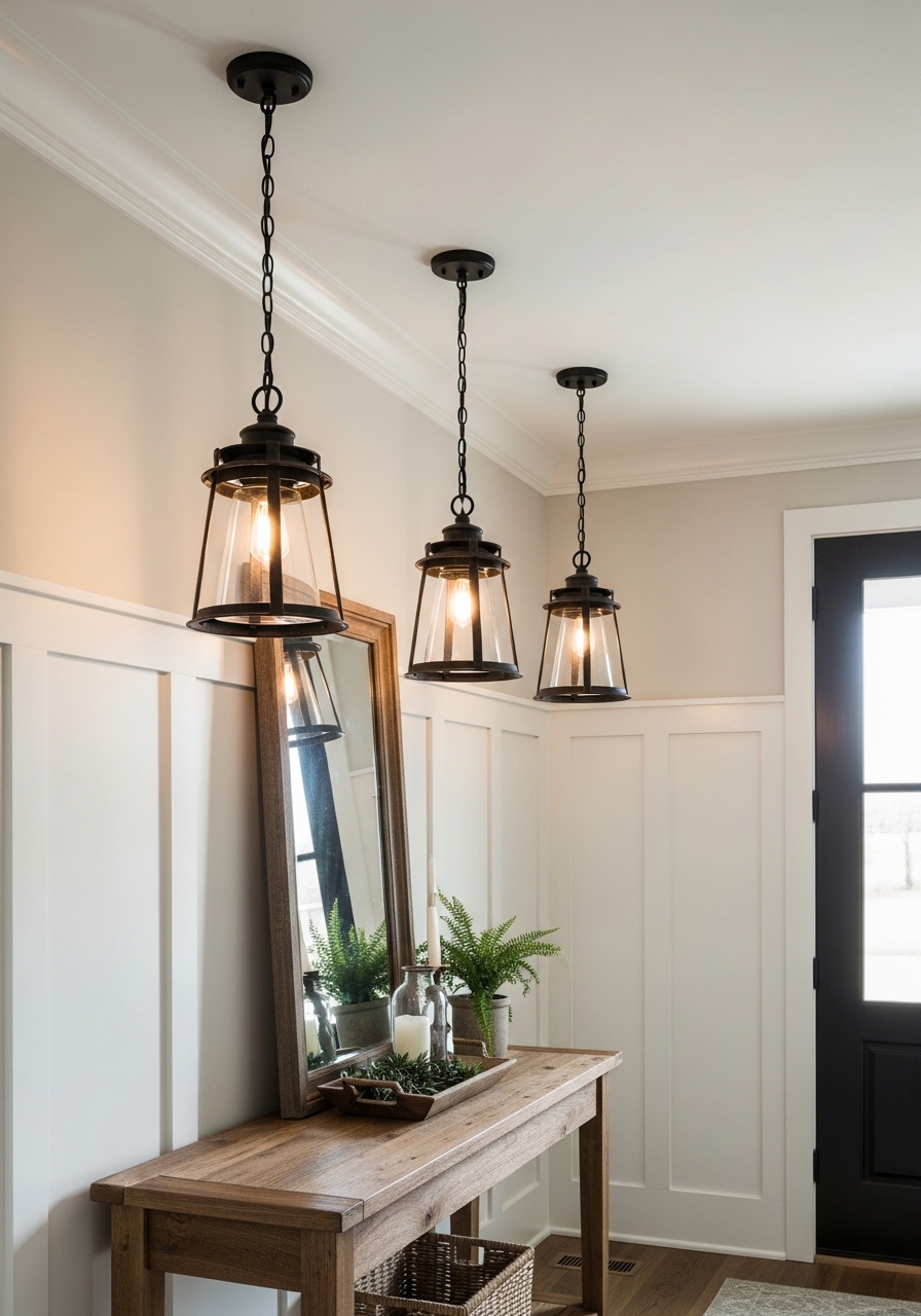 Hanging vintage-style lanterns can add that soft, glowing light to your entryway, making it feel extra cozy at dusk. I installed one in my home last month, and it totally sets a welcoming mood for guests. Pair it with dimmable bulbs for adjustable ambiance, you know, for those late-night arrivals.