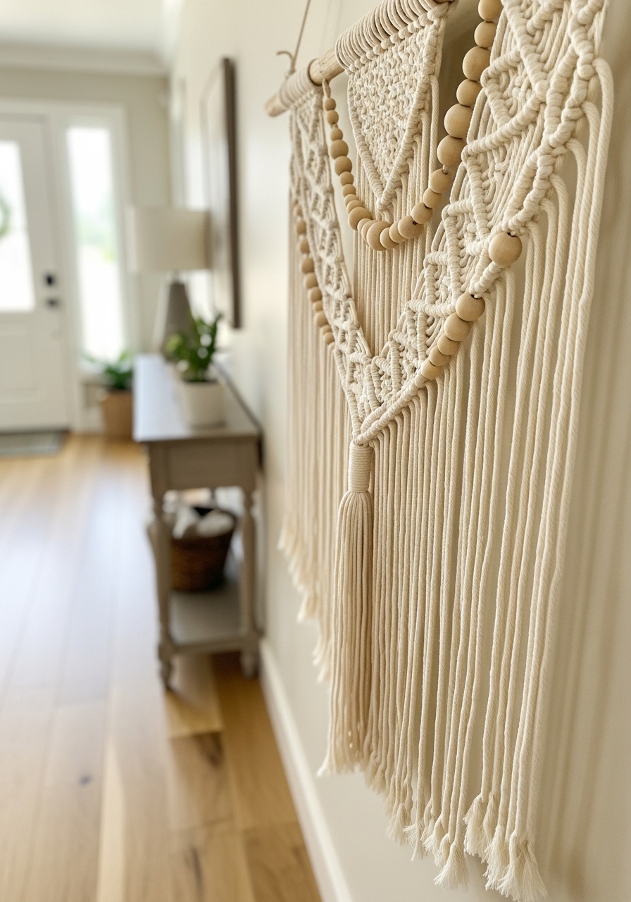 Adding a woven macrame piece to your entry wall brings texture and that boho-farmhouse coziness without clutter. I made one myself during a crafty weekend, and it softened the space instantly. Hang it above a console for mail or keys to blend style with function.