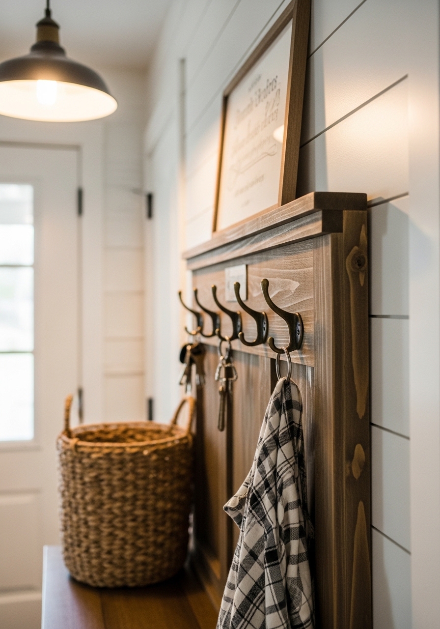 An antique-inspired key holder keeps things tidy while adding that old-world farmhouse charm. I picked one up at a flea market, and now I never misplace my keys – miracle! Mount it at eye level for easy access.