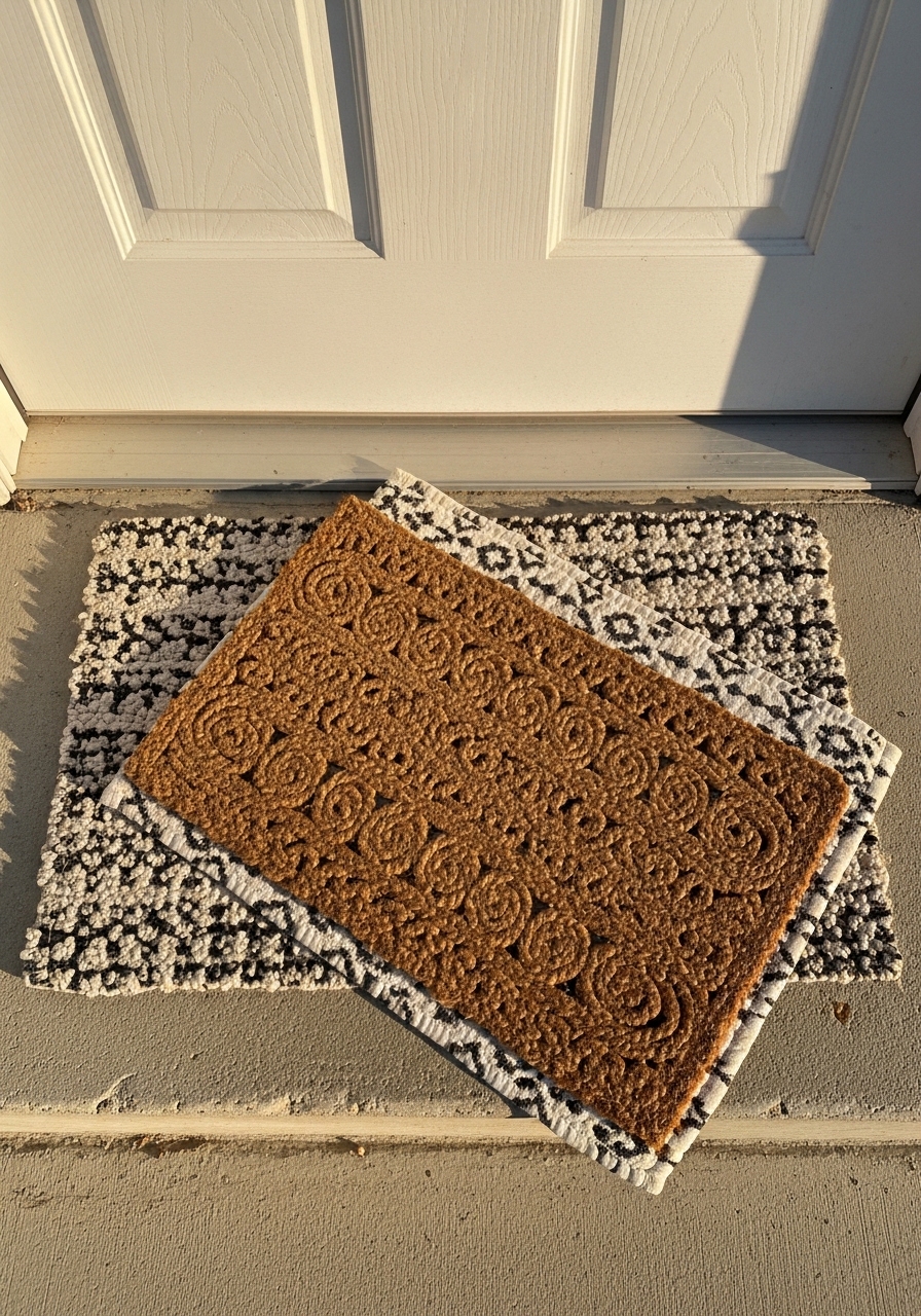 Layering doormats with different textures welcomes guests with instant coziness. I stacked a jute one over a striped mat, and it trapped dirt so well. It’s an easy, budget-friendly way to amp up the entry charm.