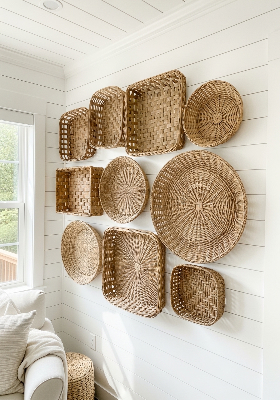 Grab some thrifted baskets and hang them as wall art for a textured, budget-savvy accent. It’s a fresh way to add storage and style without drilling into walls permanently. I hung a few in my entryway once, and they doubled as catch-alls for remotes and toys – super practical.