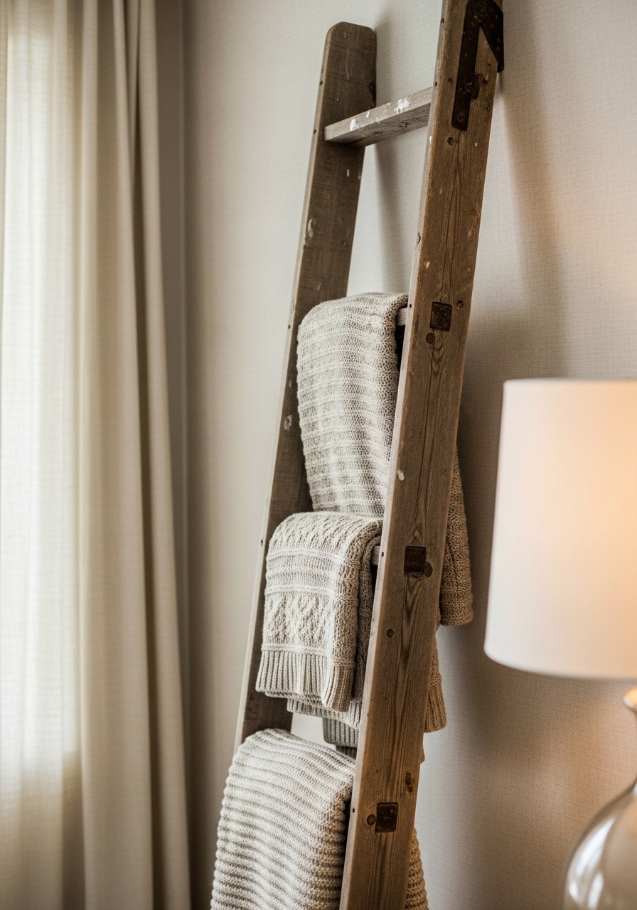 Use an old ladder as a blanket holder for that cozy, vertical storage hack. Paint it if needed, but keep it simple – I found mine at a garage sale for five bucks. It adds height and texture without cluttering the floor, and you can swap blankets seasonally.
