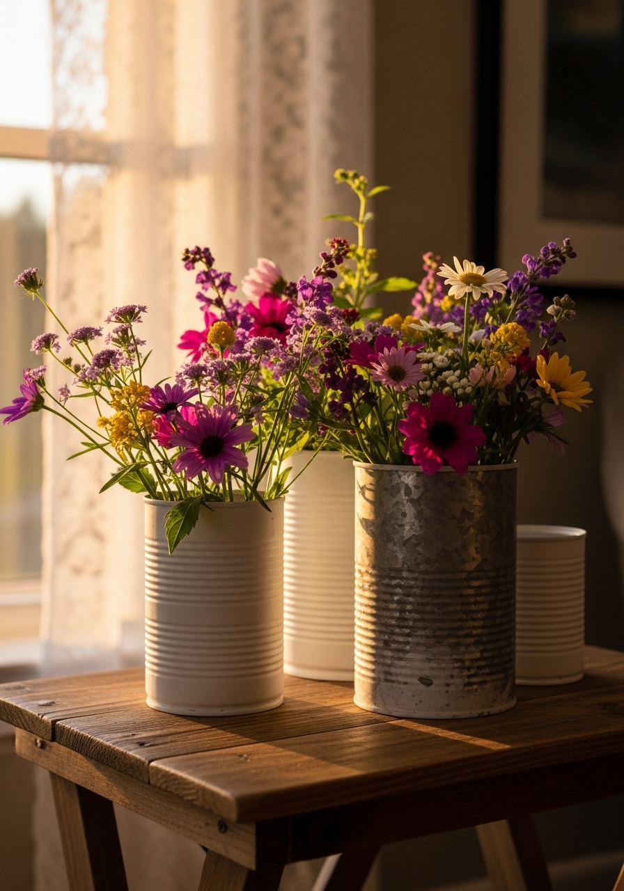 Turn empty cans into vases for a quirky, eco-friendly touch that’s basically free. Paint them neutral and cluster on shelves – I did this with soup cans once, and it added such personality. Pair with foraged flowers for that fresh-from-the-farm feel.