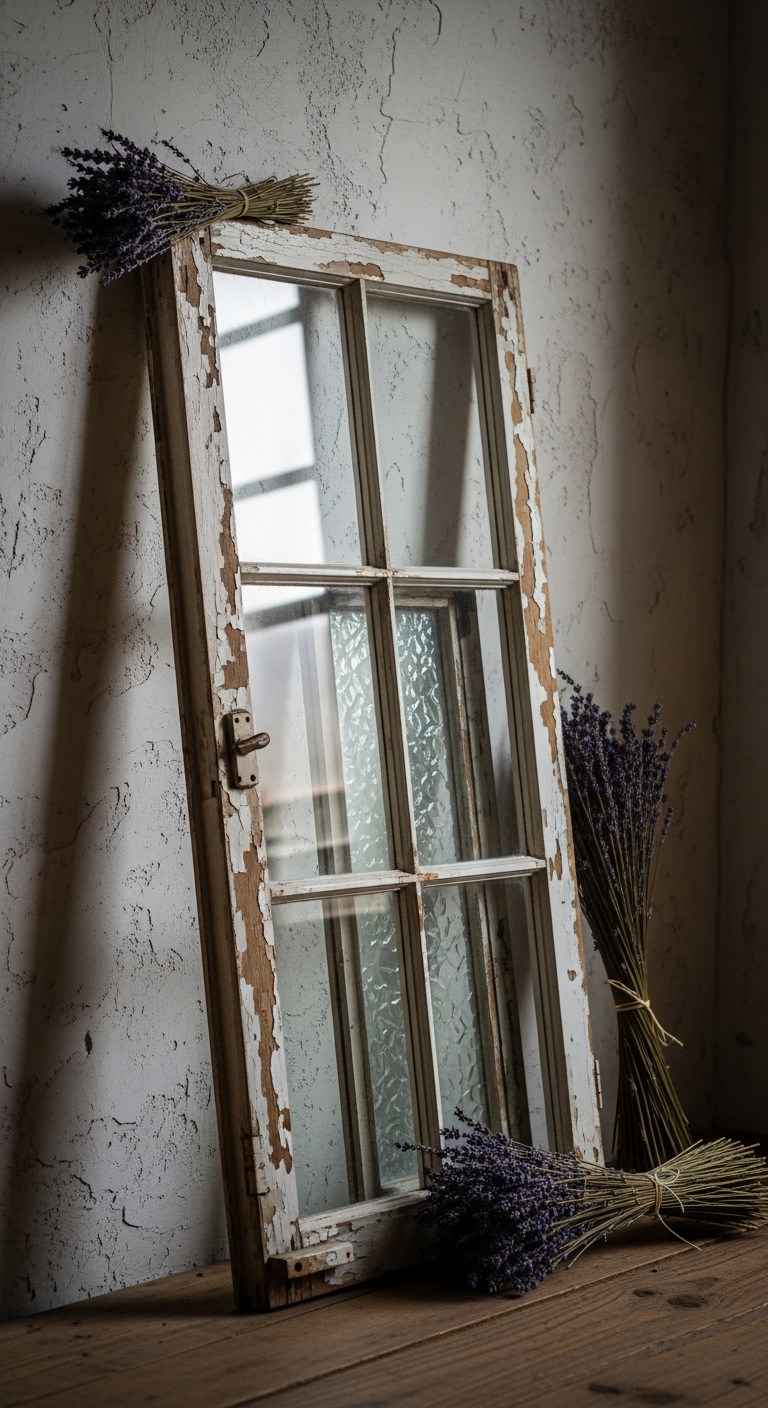 Lean a salvaged window frame against the wall for a unique, budget alternative to mirrors. Add some dried herbs or fairy lights inside for extra flair. I rescued one from a curb, painted it white, and it’s now my favorite quirky piece.
