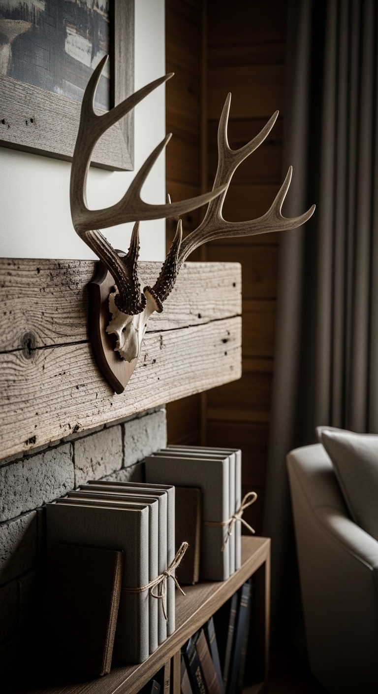Incorporate budget faux taxidermy like antlers for a bold, rustic statement. Source them from craft stores or DIY with paper mache. It adds that hunting-lodge vibe without the hunt – I paired mine with books, and it’s surprisingly elegant.