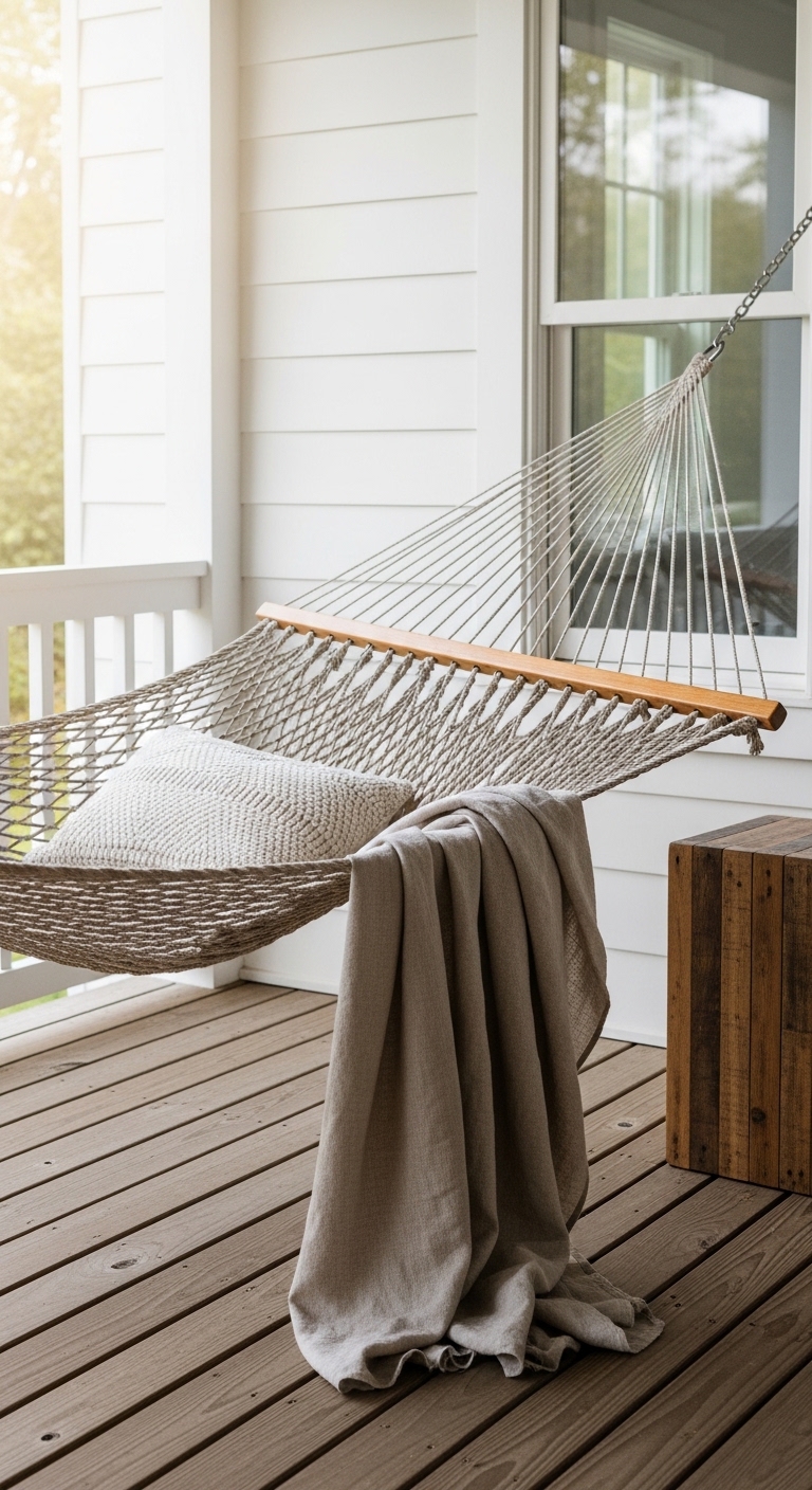 Imagine swaying gently in a hammock tucked into a quiet porch corner for that ultimate relaxation zone. I added one to my space recently, and it’s my secret hideaway for napping on weekends – just drape a soft blanket over it. It brings a fresh twist to farmhouse style without needing much room.