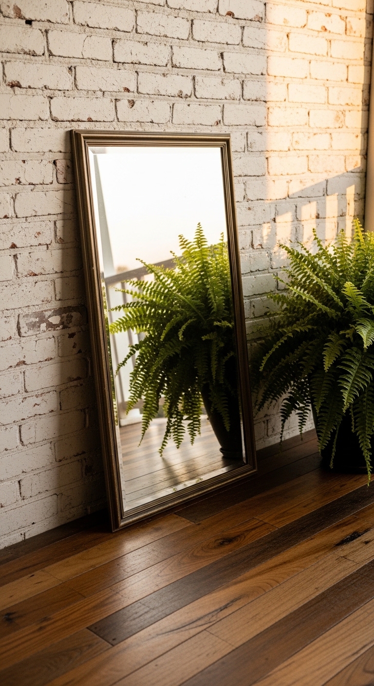Leaning a vintage mirror against the porch wall creates an illusion of more space and adds cozy depth. I found one at a thrift store, and it reflects the garden beautifully – makes the area feel bigger. It’s a subtle trick for small porches.
