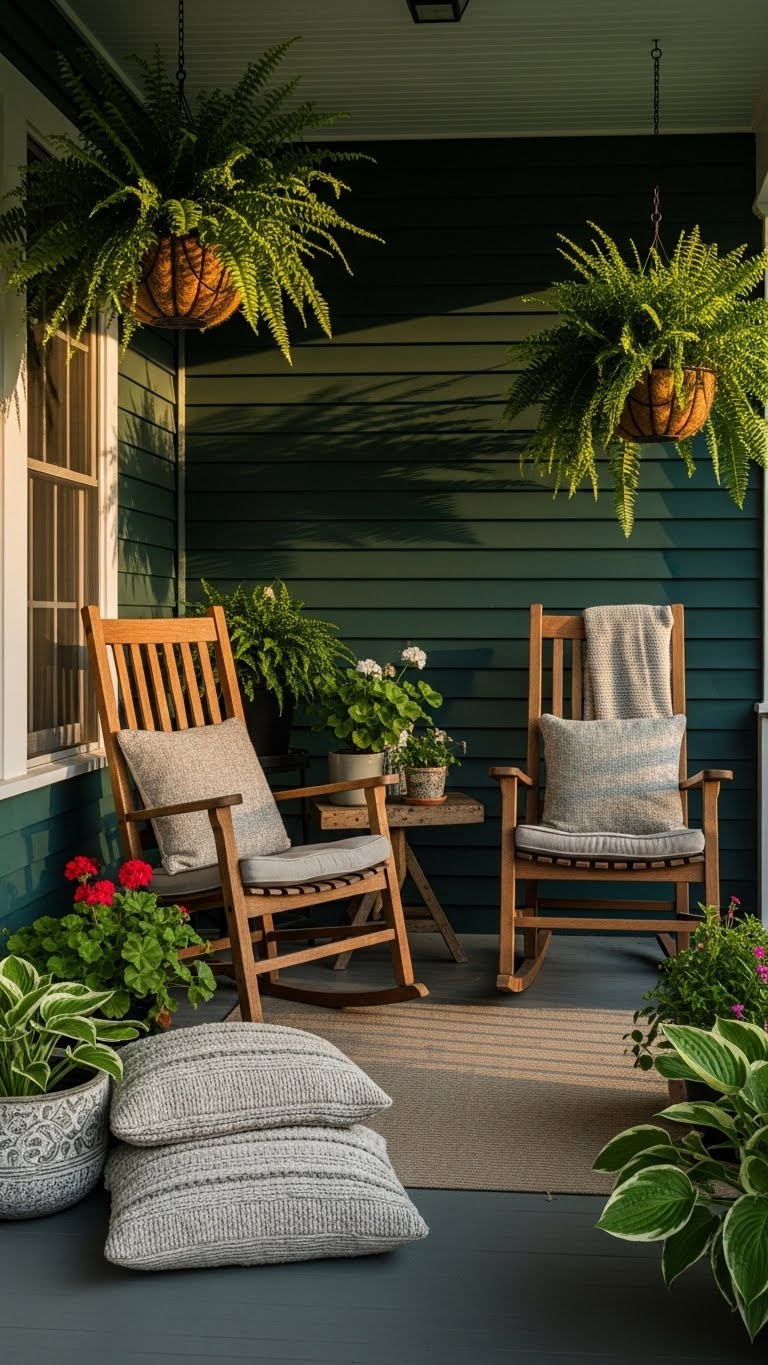Deep forest green brings a moody feel to your porch, making it feel like a peaceful retreat. Start with a gallon of eco-friendly paint for under $50. Pick a bench or railing to cover first. Break it down: Sand the surface, apply primer, then two coats of green. Add thrifted pillows in similar shades for layers. This color works well with wooden elements, creating depth without overwhelming the space. Try a DIY project: Repurpose an old door as a planter stand, painted green, and fill it with hardy ferns. Keep costs low by shopping second-hand stores. Mix in natural textures like jute rugs to tie it together. Your porch will look inviting in no time. Focus on simple swaps, like swapping out faded cushions. This approach fits any budget and adds personality fast.