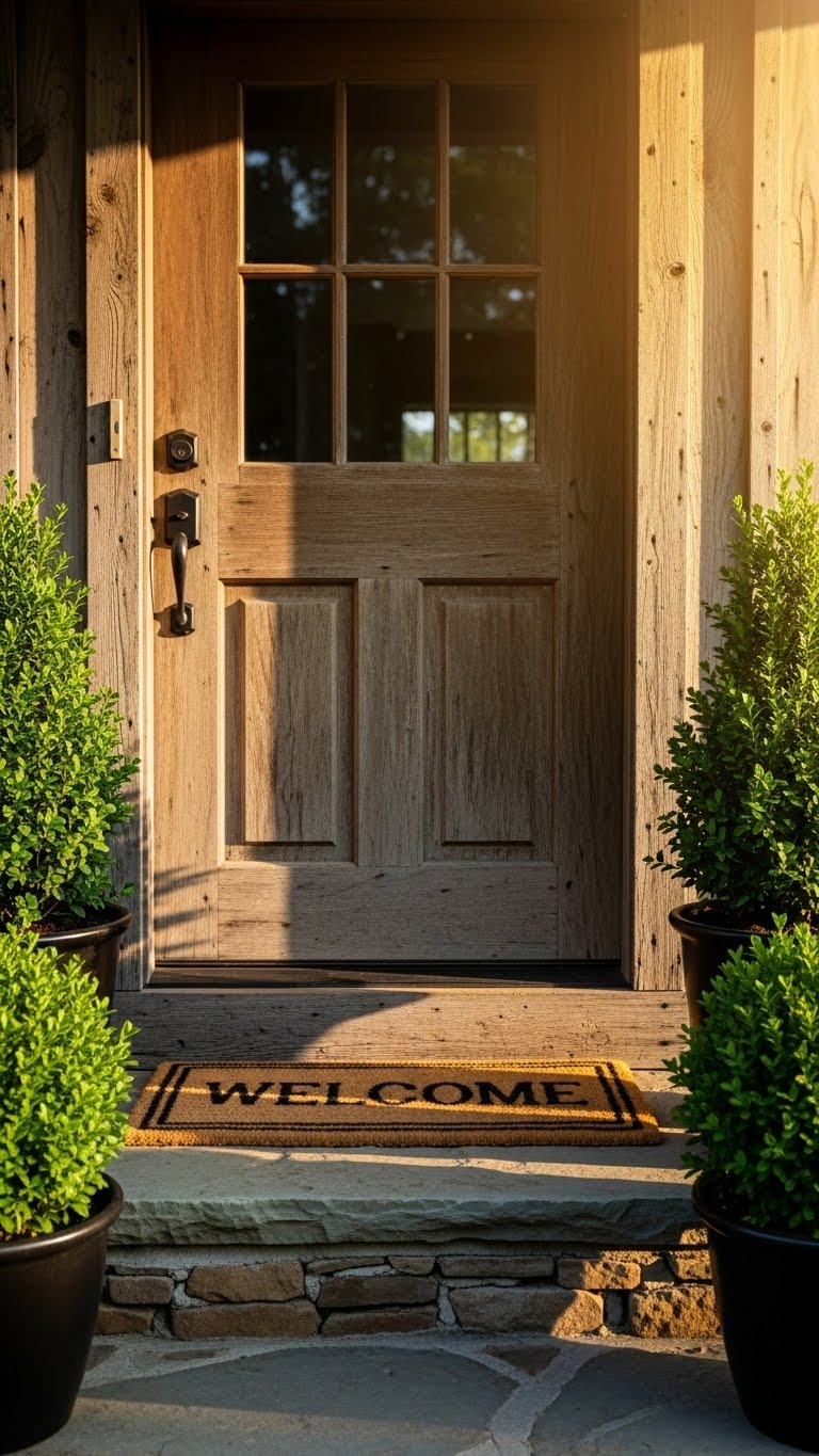 A welcome mat sets the tone right away. Find one made from coir for about $10 at a discount store. Place it at the door to catch dirt. Choose patterns that match your style, like simple stripes. Measure your entry first for the perfect fit. A budget hack: Clean and flip your old mat for a refresh. This makes guests feel at home instantly. DIY touch: Add stenciled designs with fabric paint if you want. Keep it practical: Shake it out regularly. Your porch entry will look polished and ready.