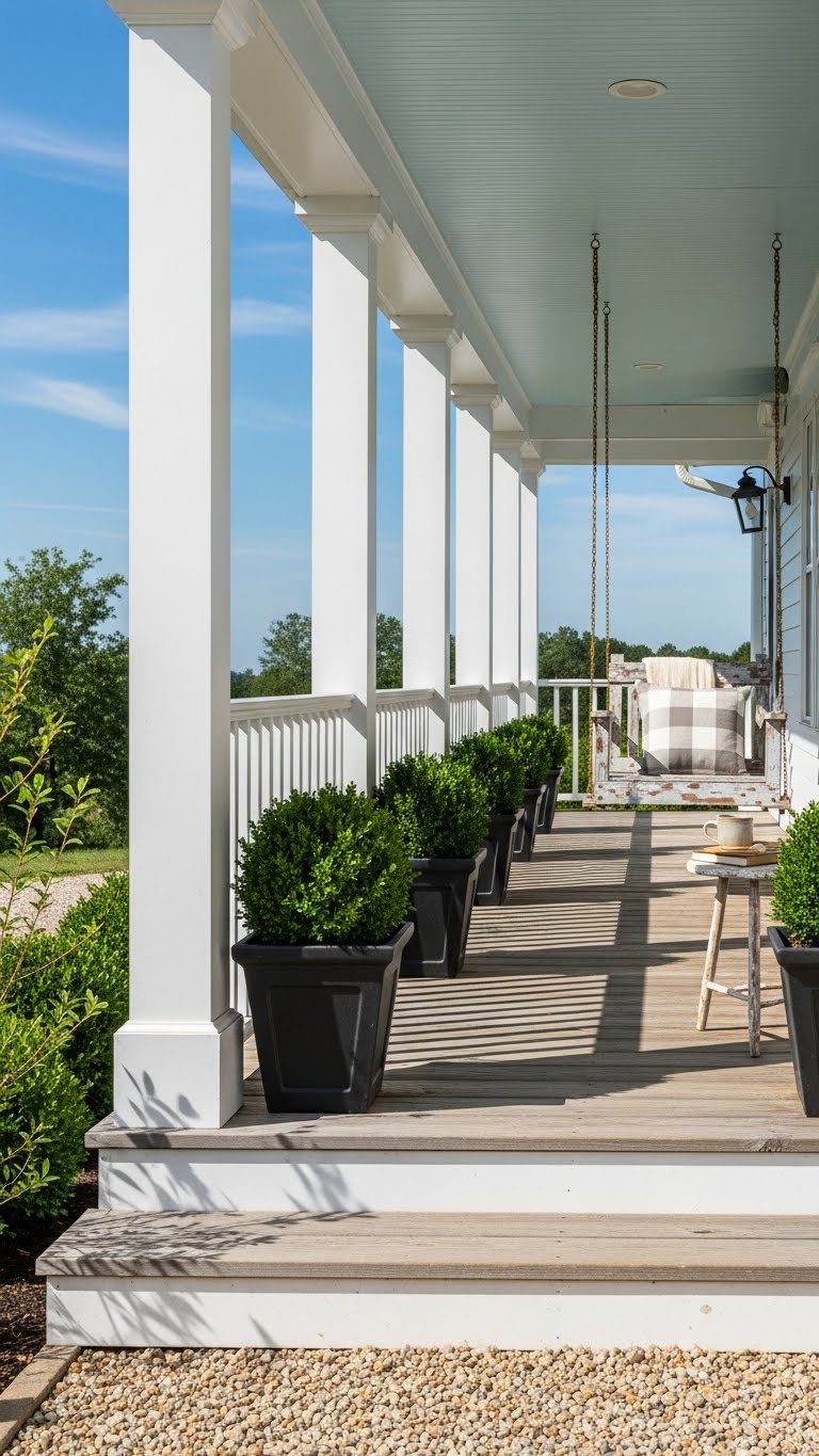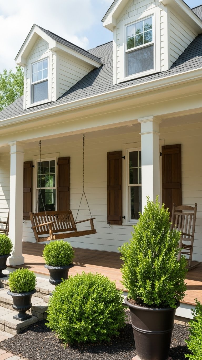 Boxwoods offer simple, evergreen appeal. Pick small plants in pots for under $20. Arrange them in groups along your porch edge. They need little upkeep, just occasional trimming. Start by placing them in sunny spots. A tip: Use affordable plastic pots and paint them to blend in. This keeps your porch green all year. DIY project: Line them up with rocks for extra texture. These shrubs add structure without fuss. Focus on easy care to save time. Your space will feel neat and timeless.