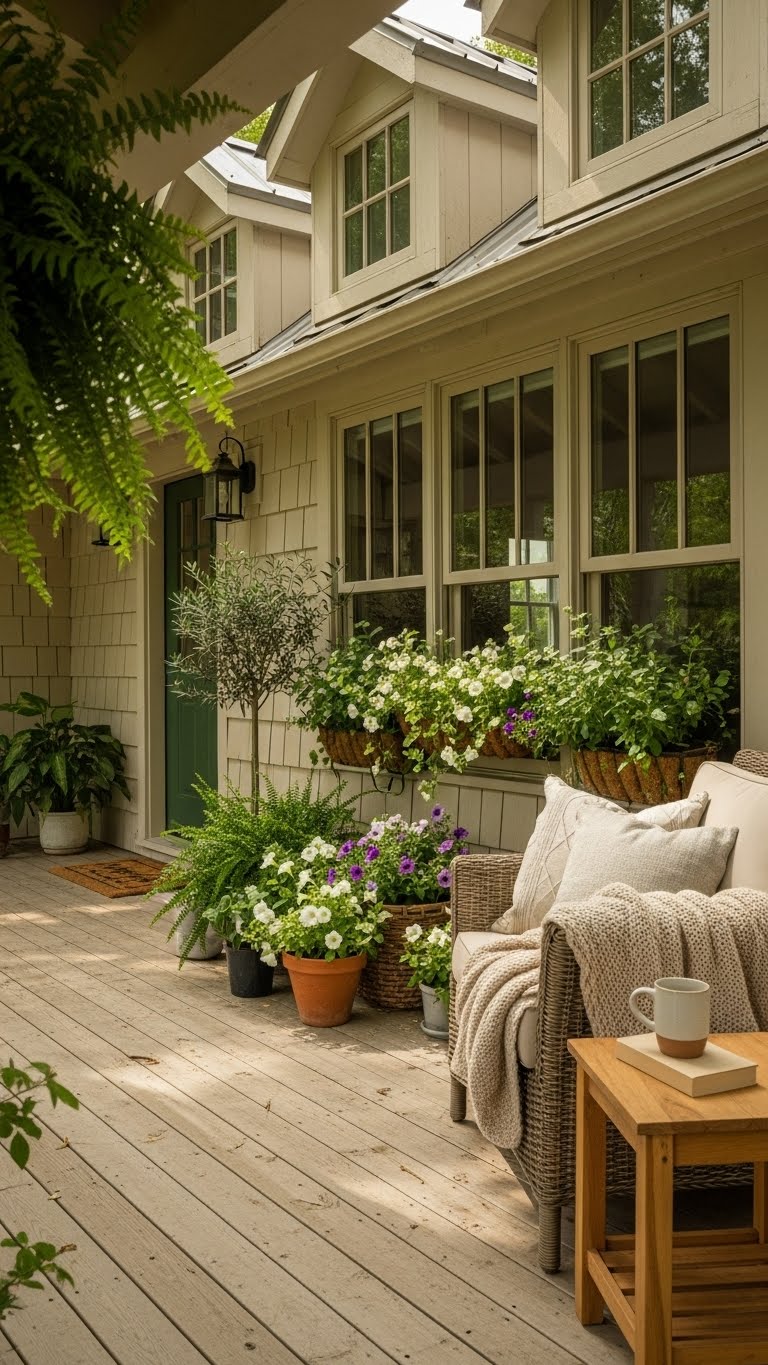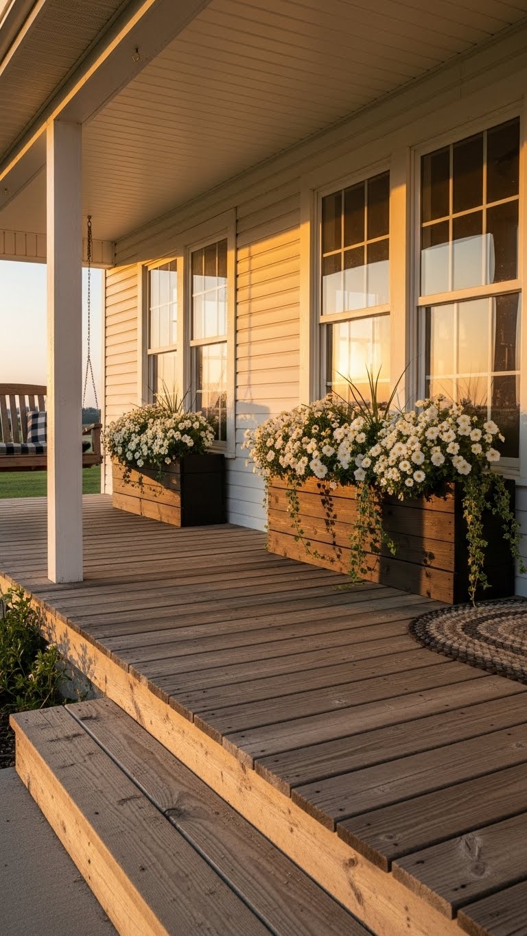 Window boxes bring extra charm to small porches. Build one from scrap wood for about $5. Attach it securely under your windows. Fill it with affordable flowers like petunias. Plant them in a simple mix of soil and add drainage holes. A budget idea: Reuse old containers and paint them white. This adds color without taking up floor space. DIY step: Drill holes and line with fabric for moisture control. Keep watering routine: Do it every few days. Your porch will look more inviting and full.