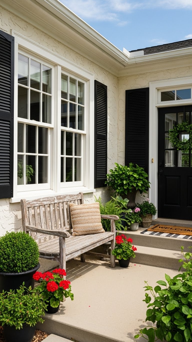 White schemes with black and wood keep it simple. Paint surfaces white for $25. Add black shutters or wood pieces. Arrange them for contrast. A budget idea: Use what you have and touch up. This creates a clean look. DIY step: Install shutters from kits. Focus on balance. Your porch will stand out.