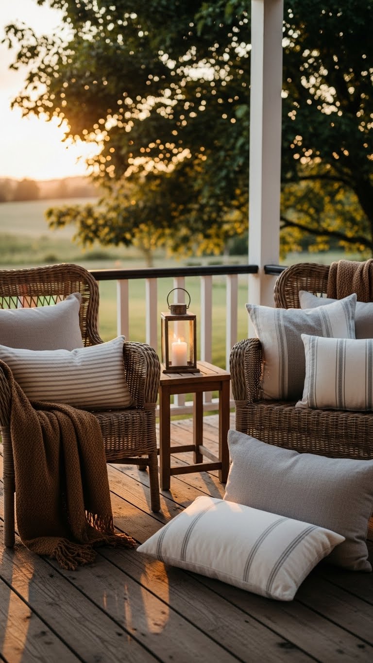 Linens and cottons create a cozy seating area. Find fabrics on sale for under $10 a yard. Cut and sew simple covers for your chairs. Layer them for added comfort. Mix patterns lightly to keep it balanced. A budget tip: Use old sheets and hem them yourself. This makes lounging easy and fun. DIY idea: Add ties to secure the fabric in place. These materials wash well for regular use. Focus on soft textures that feel good. Your porch will be a relaxing spot.