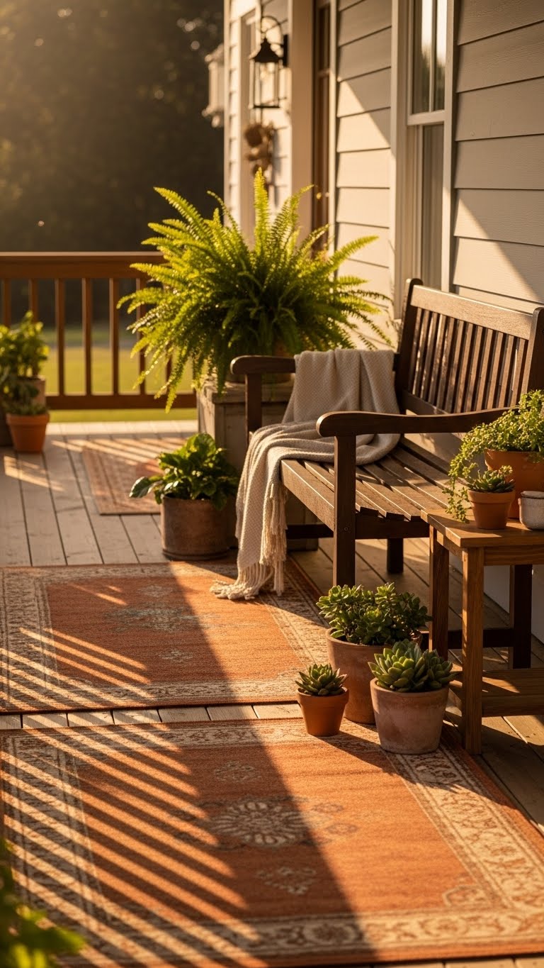 Warm tones like terracotta warm up your porch. Pick a rug or pillows in these colors for less than $25. Place them on floors or seats for instant change. Start with one item to test. A tip: Shop end-of-season sales for deals. This replaces cooler shades with something cozier. DIY project: Paint a planter in terracotta and add plants. These colors pair well with natural elements. Keep it simple: Just swap out what you have. Your space will feel more welcoming.