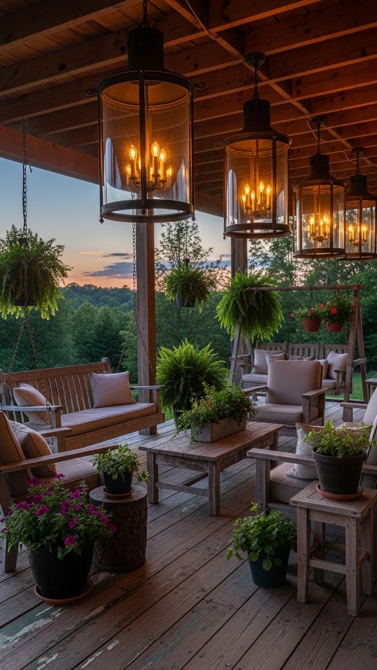 Oversized lanterns light up your porch evenings. Get one from a budget store for about $15. Hang it from hooks on the ceiling. Use LED bulbs for safety and savings. Position them over seating areas. A tip: Add a timer to turn them on automatically. This makes nights magical. DIY angle: Wrap lanterns with twine for a rustic look. They provide just enough light without glare. Start with one to see the effect. Your porch will be perfect for gatherings.