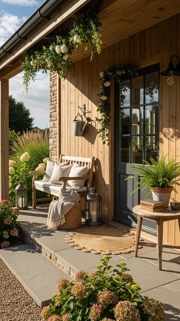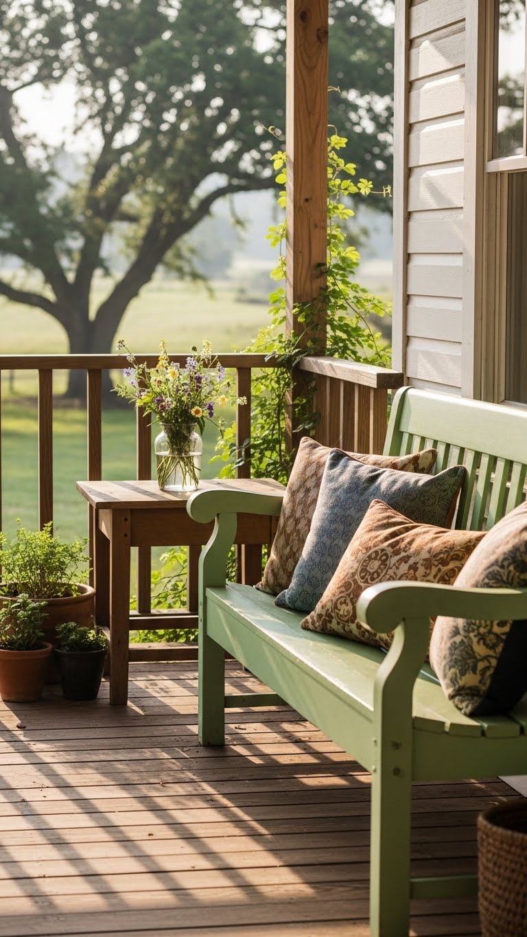 Relaxed benches with patterns make a cottage feel. Find or paint one for $20. Add cushions in fun fabrics. Arrange it for sitting or decor. A budget hack: Cover old cushions with new fabric. This creates a casual vibe. DIY touch: Stitch simple patterns yourself. These pieces invite relaxation. Keep them weatherproof. Your porch will feel like a getaway.