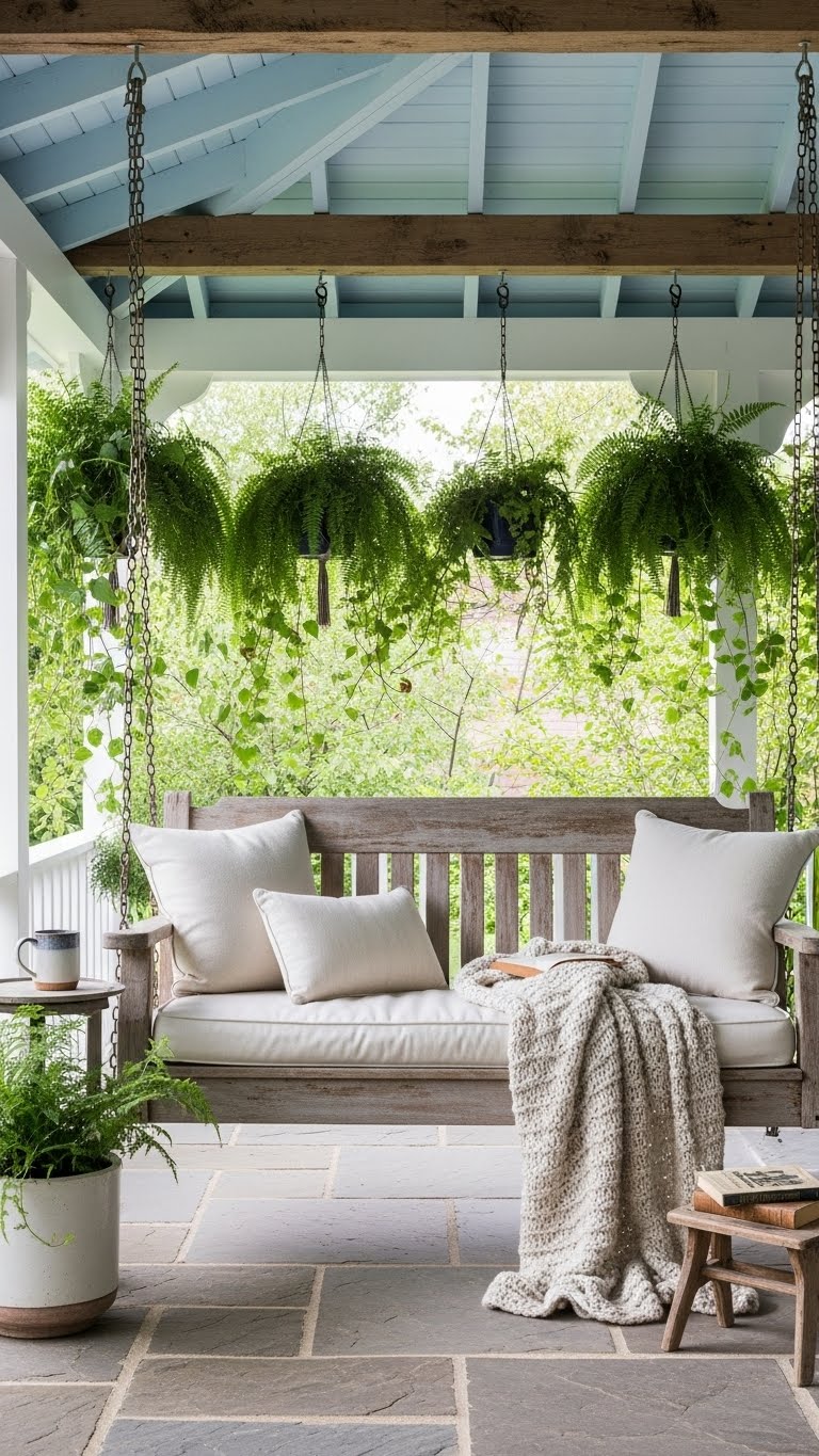 Hanging ferns add classic charm to your porch. Get a few plants and hooks for less than $15. Install them on beams or rails for easy access. Choose ferns that thrive in shade to save on care. Hang them at eye level for the best view. A simple tip: Water them weekly with a basic sprayer. This brings a fresh, green vibe without much work. DIY idea: Use twine to create your own hangers from scrap wood. These pots brighten up small spaces fast. Keep them simple: Trim dead leaves to maintain shape. Your porch will feel alive and welcoming.