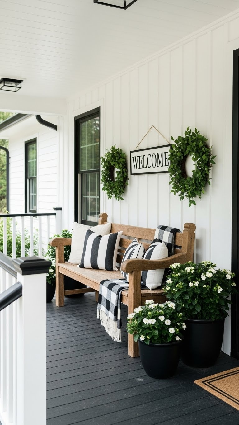Black, white, and green combos feel minimalist. Gather items in these colors for cheap. Place a green wreath on the door. Mix with black frames or white pots. A tip: Rotate seasonal greens. This keeps things fresh. DIY project: Make a wreath from yard clippings. These elements work well together. Start small for impact. Your porch will look polished.