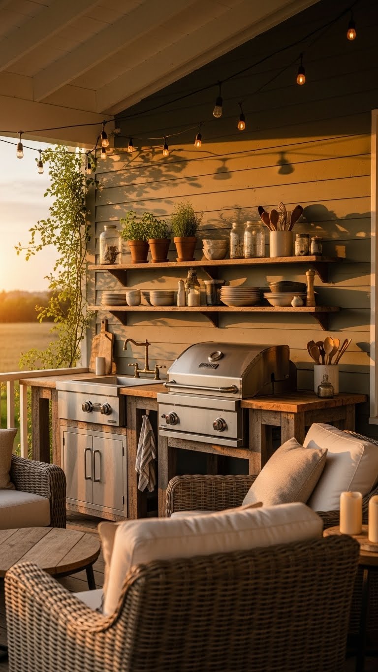An outdoor kitchen makes entertaining easy. Use a portable grill for $50. Add shelves from wood scraps. Set it up near seating. A budget hack: Repurpose kitchen items outside. This creates a hub for meals. DIY idea: Build counters from pallets. Keep it functional for gatherings. Your porch will be the spot for fun.