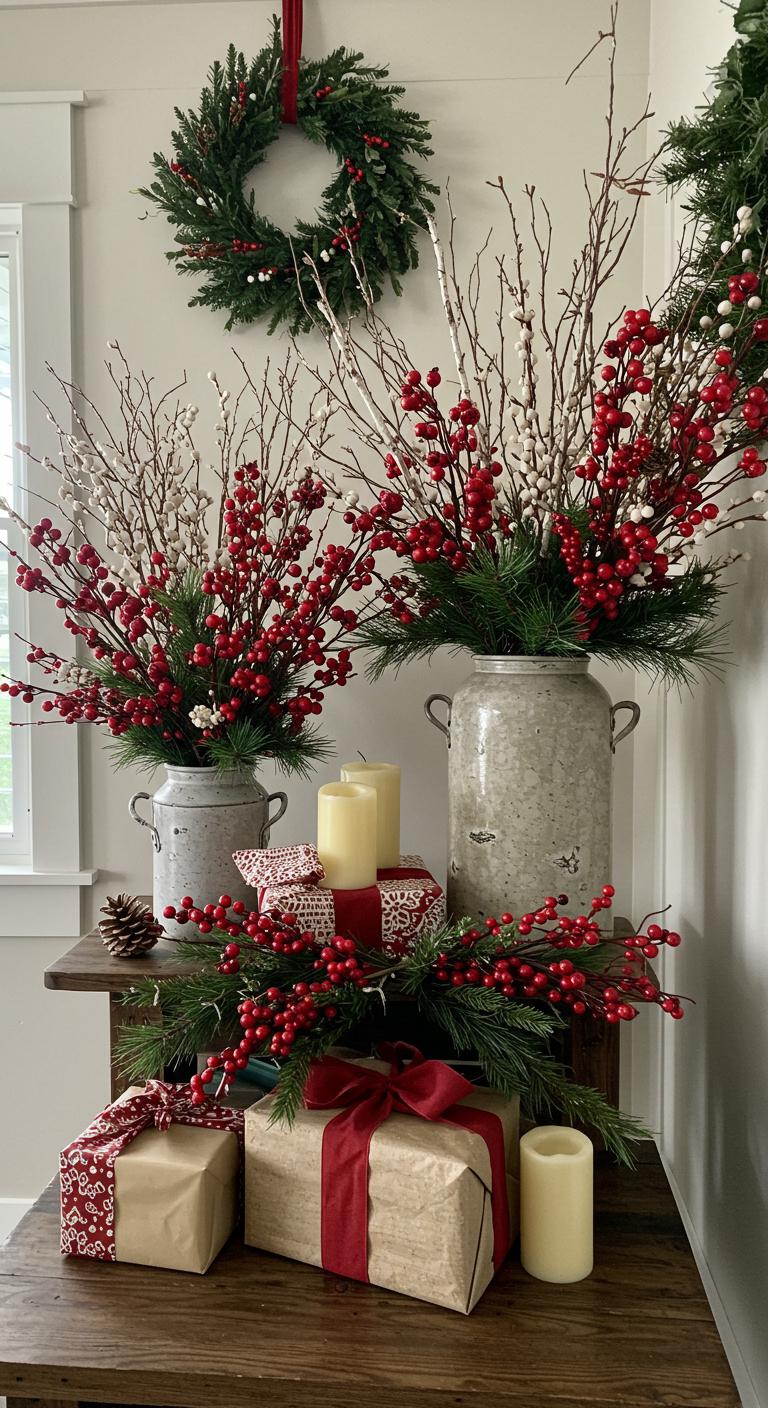To elevate your farmhouse Christmas decor, consider incorporating berry and branch arrangements that bring the beauty of nature indoors.