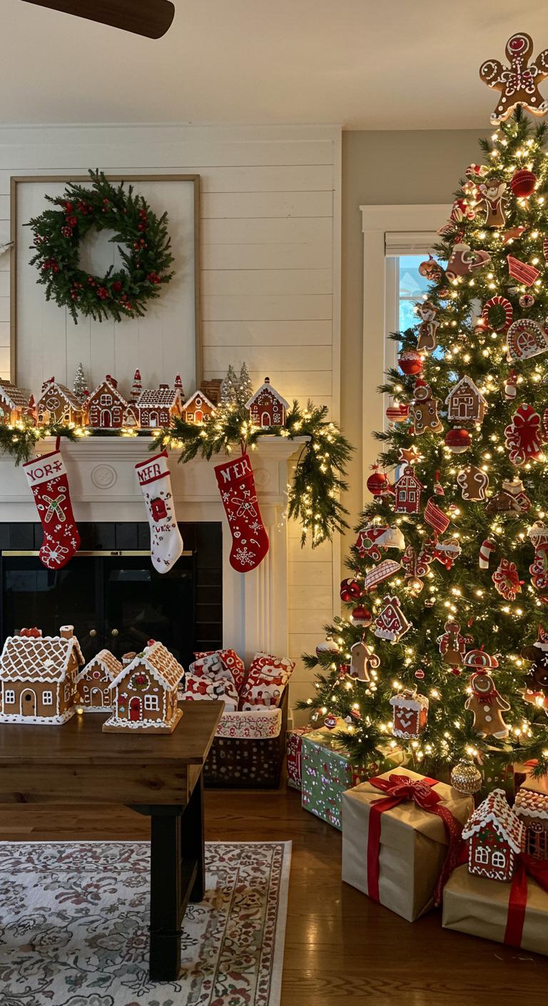 Scatter miniature gingerbread houses on your mantel for a sweet focal point. These touches invite joy and creativity, making your home feel cozy and festive, perfect for the holiday spirit.