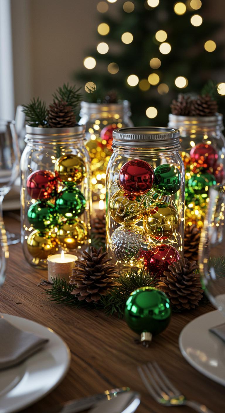 You can create stunning mason jar arrangements filled with festive jar fillers like colorful ornaments, pinecones, or twinkling fairy lights.